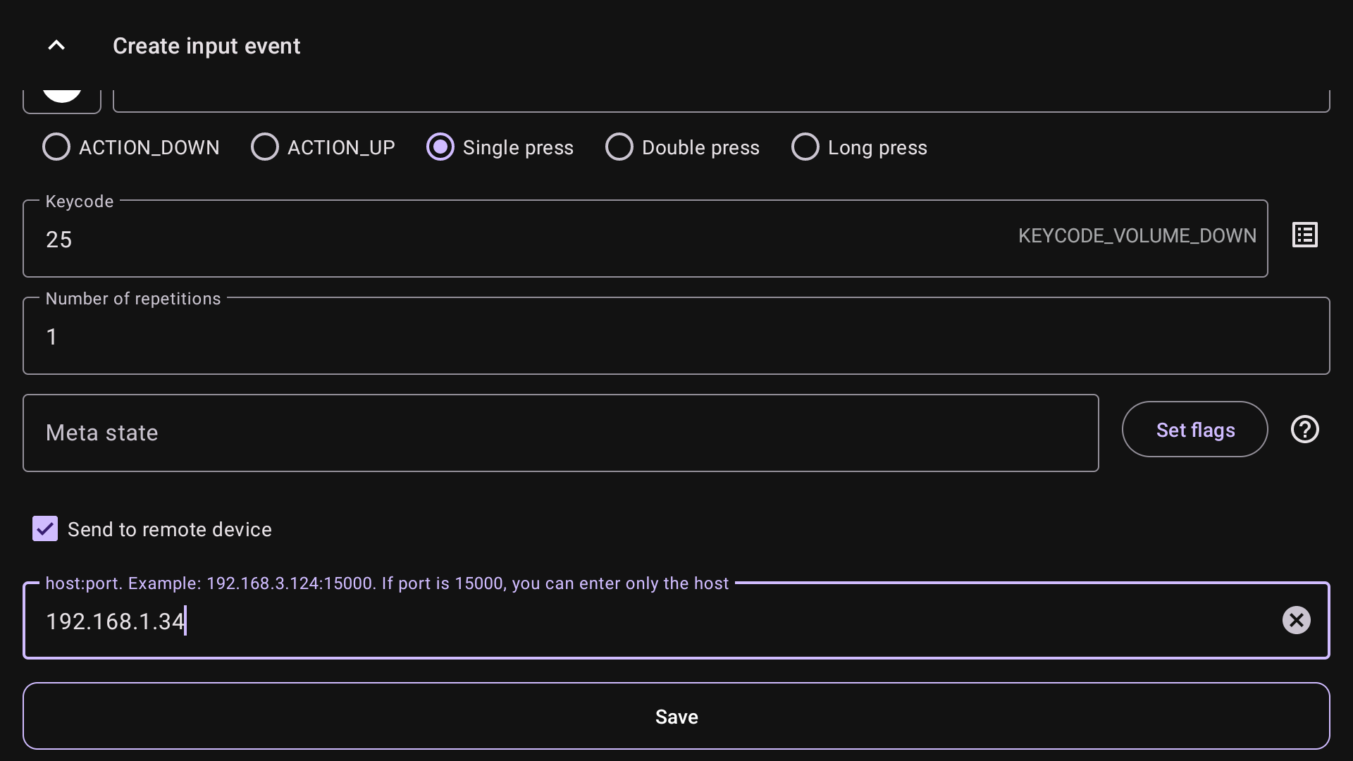You also can configure sending input event to another Android device with installed tvQuickActions and enabled "Use ADB speed up". Just enter IP address of the remote device