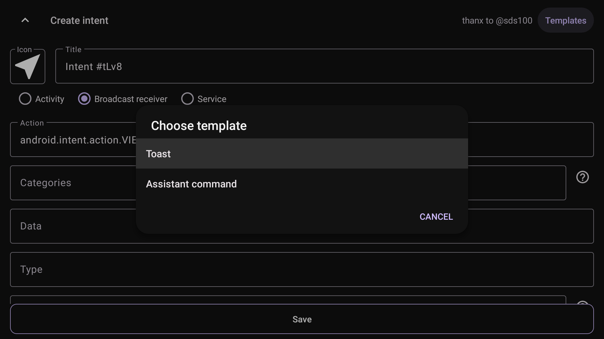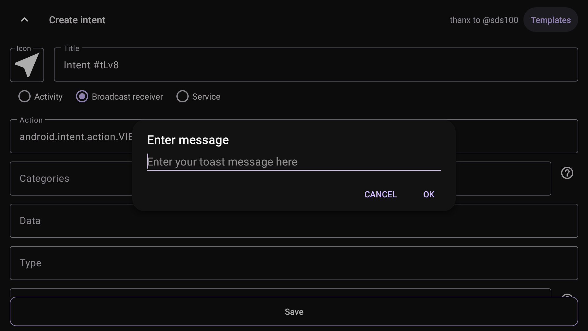You can also use it as action ADB shell commands. The way to create it in the app is similar to the intents and tap screen: 1. Enter the title and choose the icon