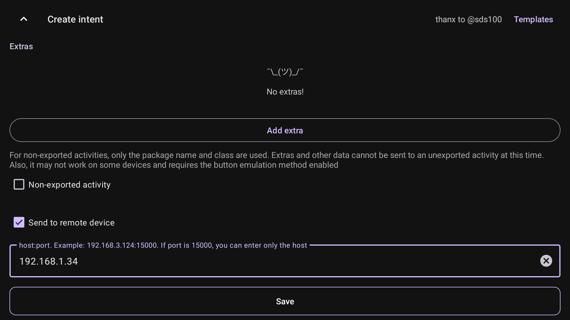 You also can configure sending intent to another Android device with installed tvQuickActions and enabled "Use ADB speed up". Just enter IP address of the remote device