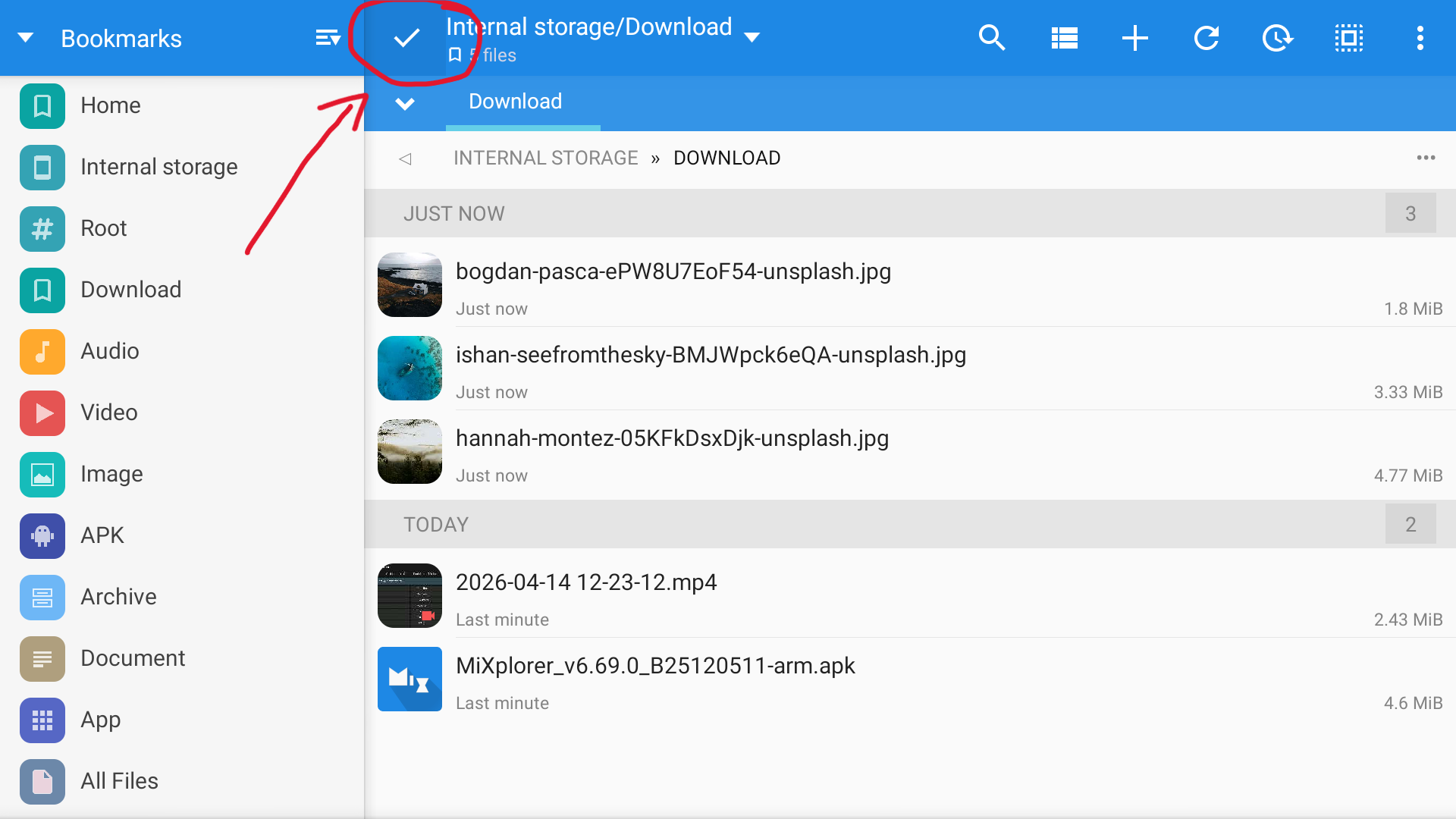 Depending on the app, select an action and save it. In my case, I open the Downloads folder in MiXplorer and press ✅ to save it.