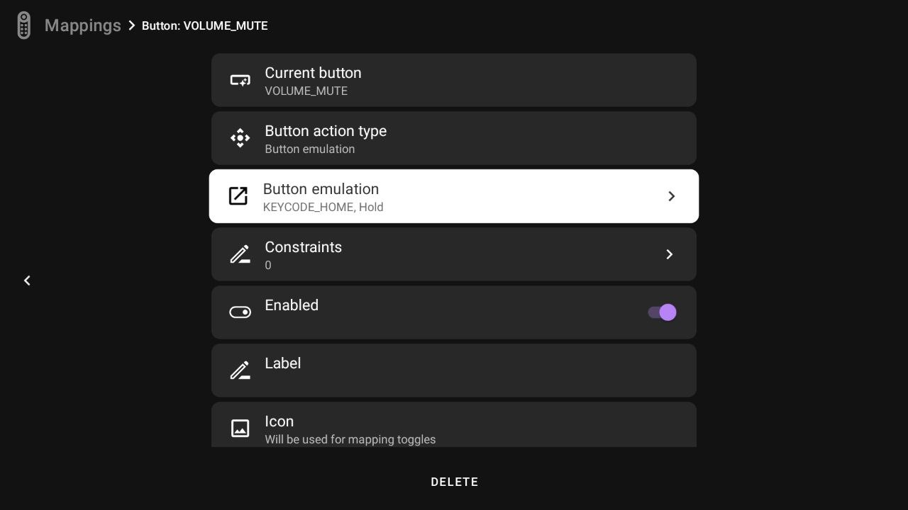 Mappings is a screen with a list of remapped buttons and an option to remap a new button. You can also see whether a mapping is disabled or has constraints.
