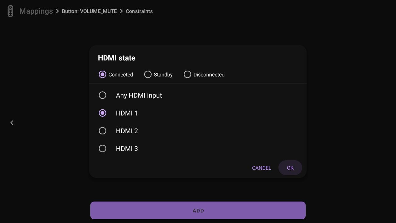 You can also create mappings based on the HDMI state. For example, in this case, we selected HDMI 1 and chose 'Connected', so the mapping will only work when these conditions are met.