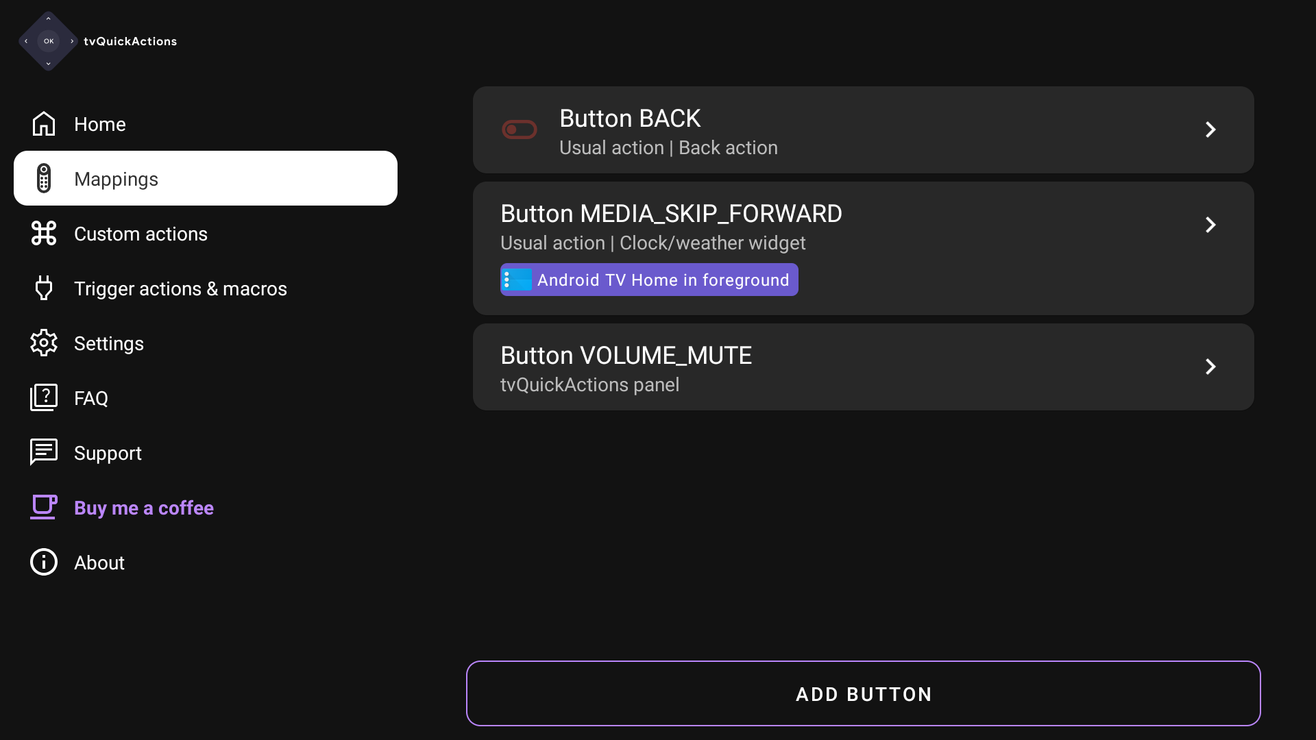 There are three remapping types in the app: usual action, tvQuickActions panel, and button emulation. The default type is "tvQuickActions panel".