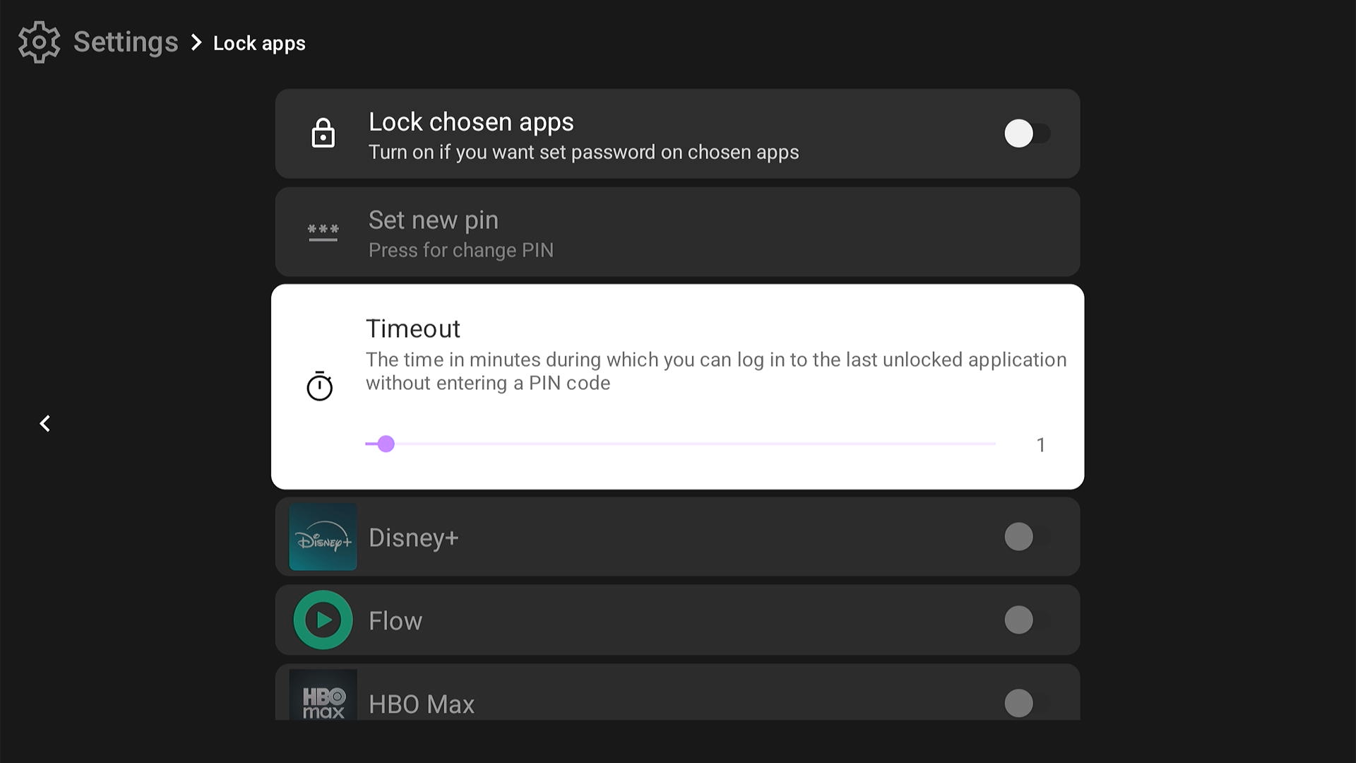 One more tvQuickActions feature - lock apps with a PIN. Here you can enable this feature, set a PIN code, and choose apps to block